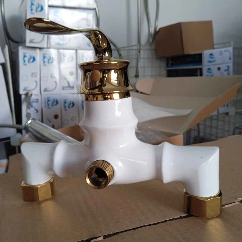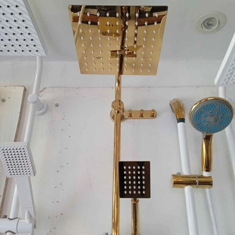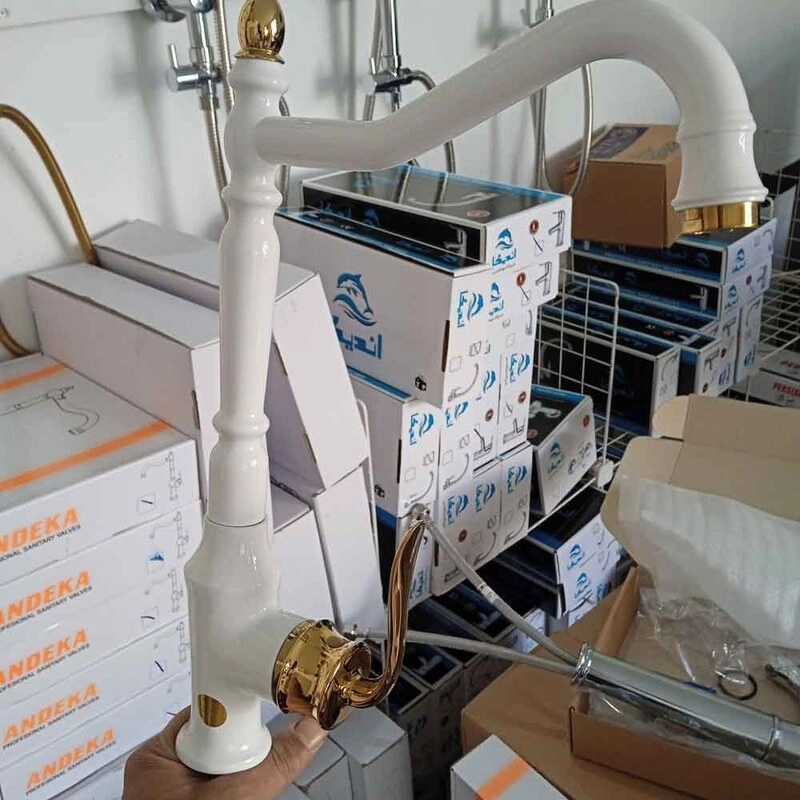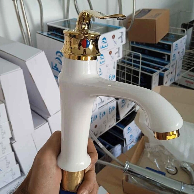 . ست 6 عددی شیرالات اهرمی آیدا مدل بامبو سفید طلایی(روشویی، ظرفشویی، توالت، حمام، شلنگ با علم دوش دوکاره استیل)